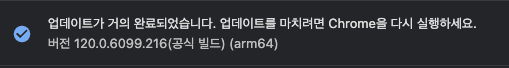 실행된 chrome에서 설정->Chrome 정보 에 들어가보면 (arm64)라고 표시되어야 정상이다.(M1~M3 기준)