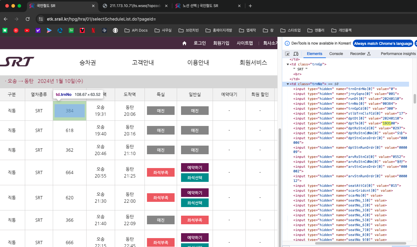 크롬 개발자 도구로 소스를 만지다 보니, "trnNo" class 안에 해당 기차의 정보가 매우 예쁘게 정리되어 있는 것을 확인할 수 있다.