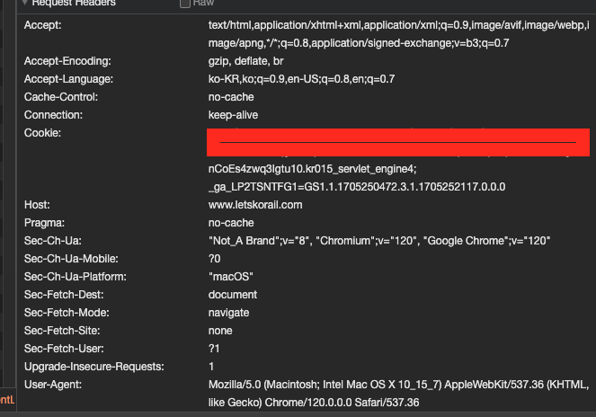 SRT는 이 작업을 안해줘도 문제가 없었는데, 코레일에서는 헤더값을 보고 정상적인 브라우저 요청인지를 검토하는 것 같다.