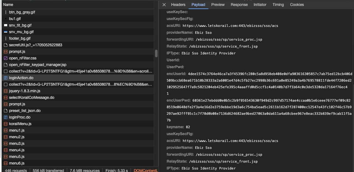 - acsURI : 고정 - "https://www.letskorail.com:443/ebizsso/sso/acs"